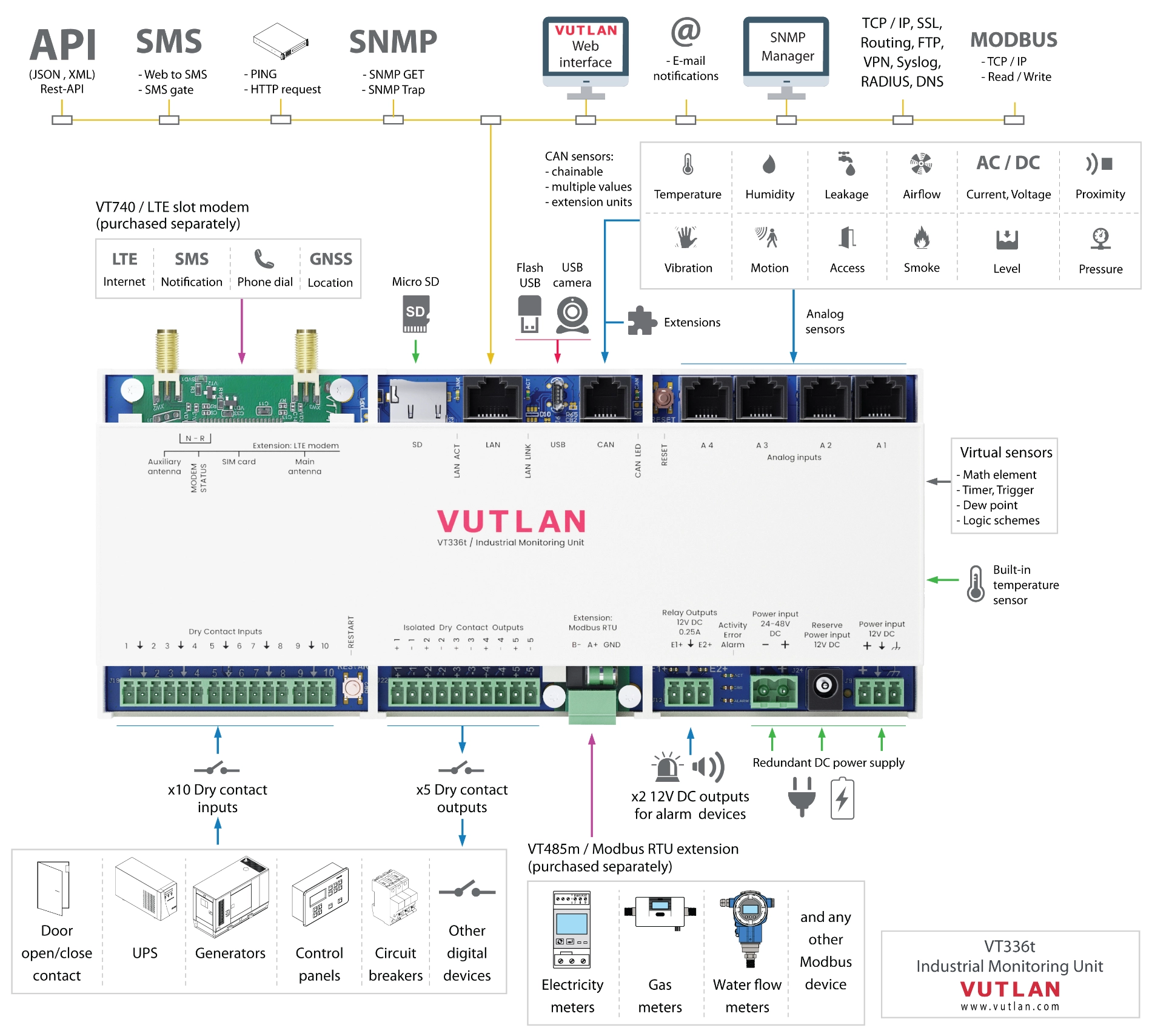 Monitoring: Measures temperature, humidity, voltage, access, smoke, dust, vibration, access, leakage, movement, airflow.