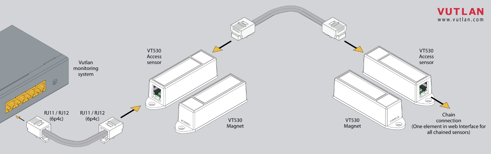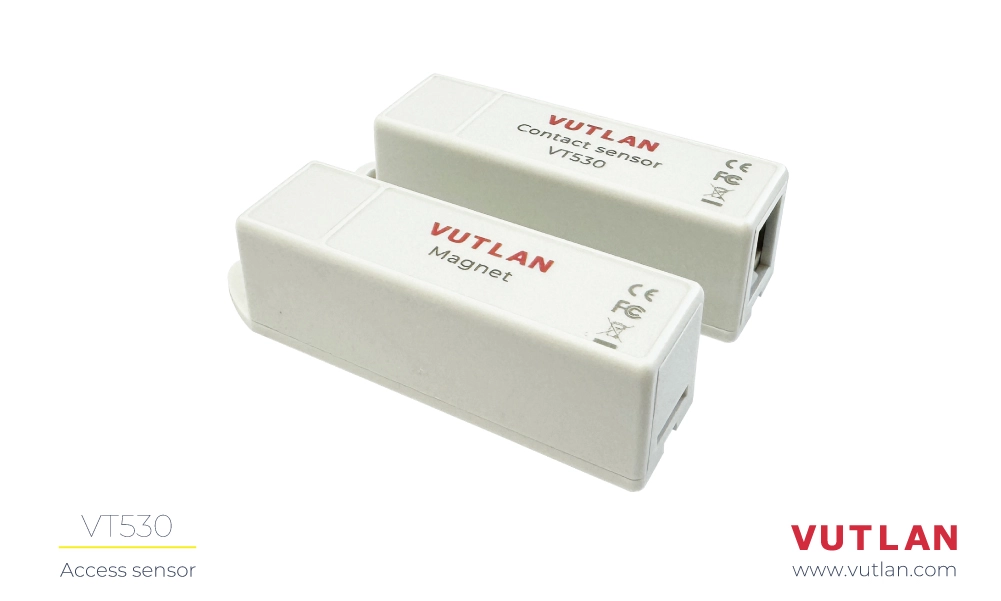 The VT530 Access Sensor is essential for access control and is designed to monitor the status of doors and windows (open or closed). It consists of two parts: a magnet and a sensor.