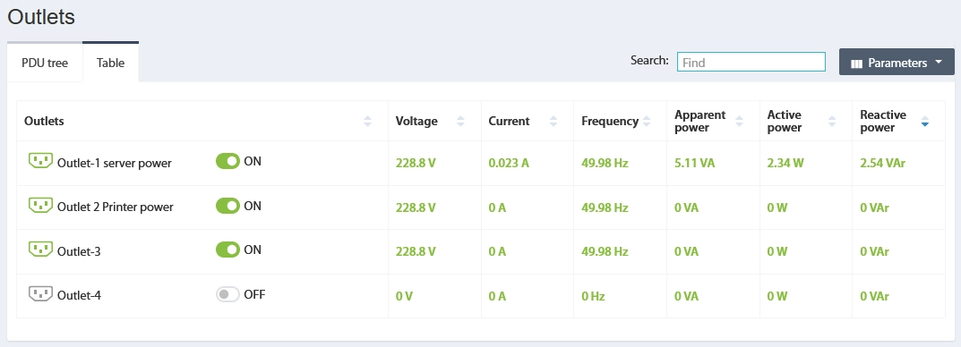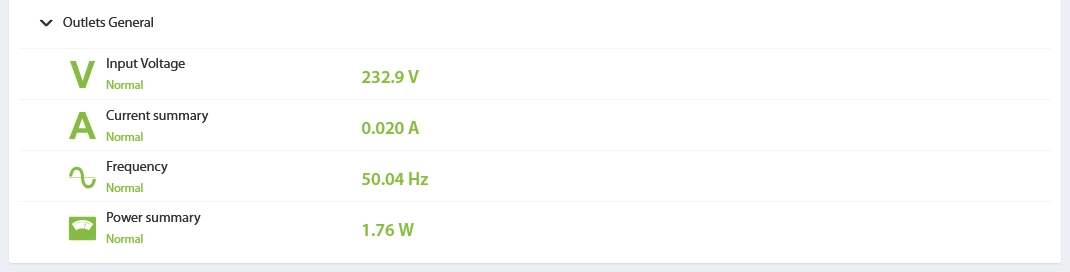 - Power monitoring (per Outlet): Voltage (V), Current (A), Power (W), Frequency (Hz), Active power (W), Real power (W), Active energy (kWh), and Real energy (kWh) are measured with high accuracy at each outlet.