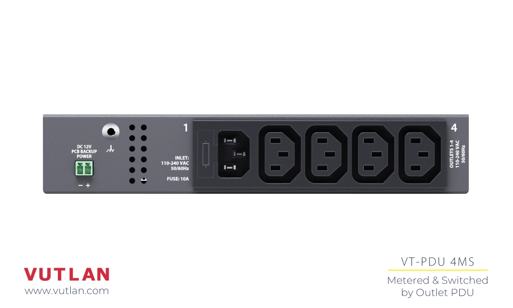 VT-PDU 4MS / Switched PDU with 4 metered outlets is a network-controlled power distribution unit designed to monitor and control four individual outlets with high measurement accuracy and advanced management features.