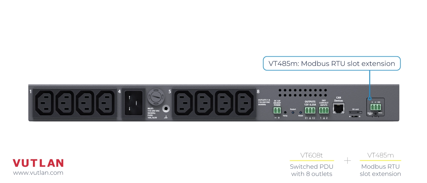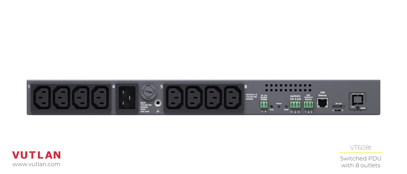 VT608t / Switched PDU with 8 outlets can be used to control four individual outlets, including: