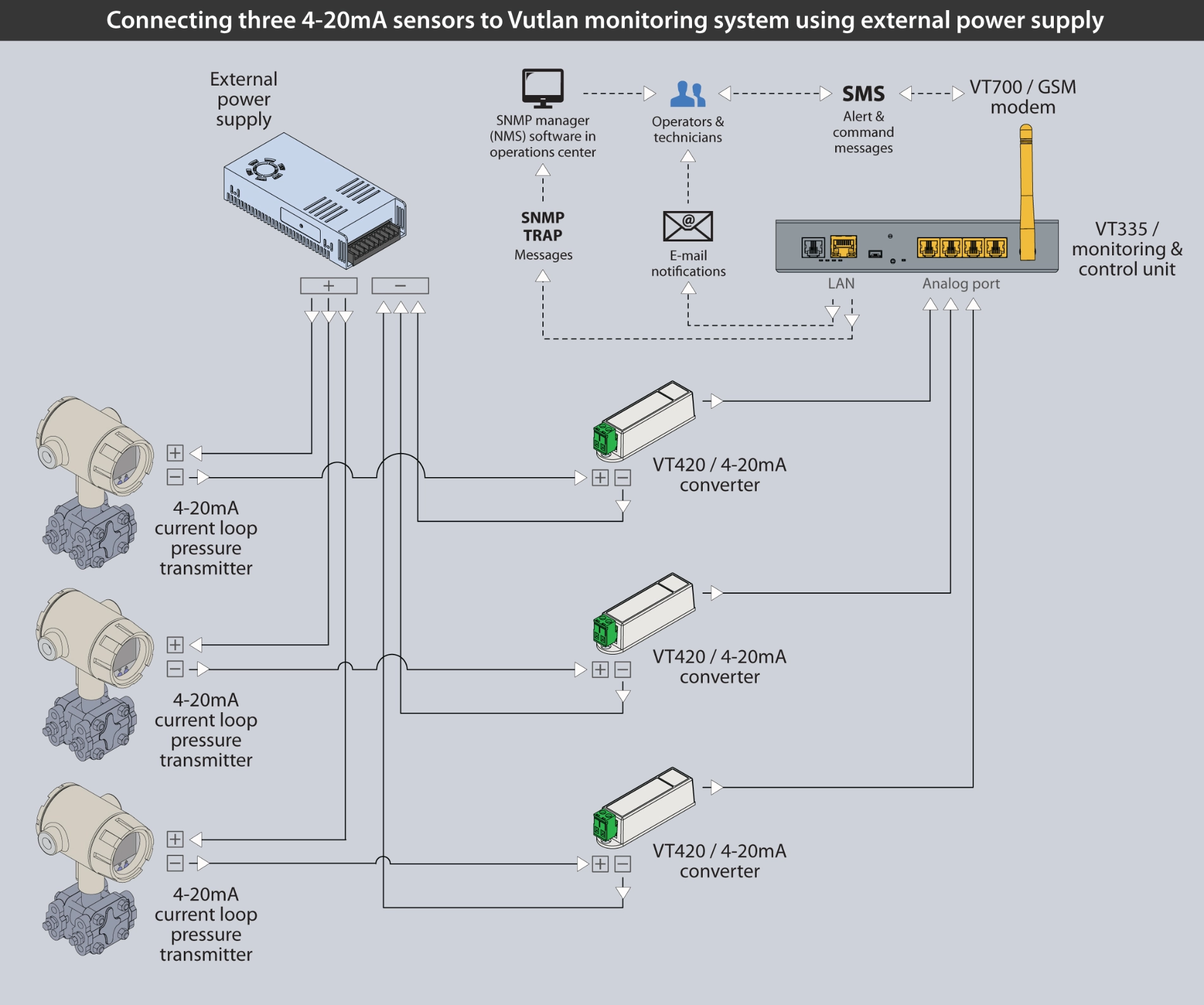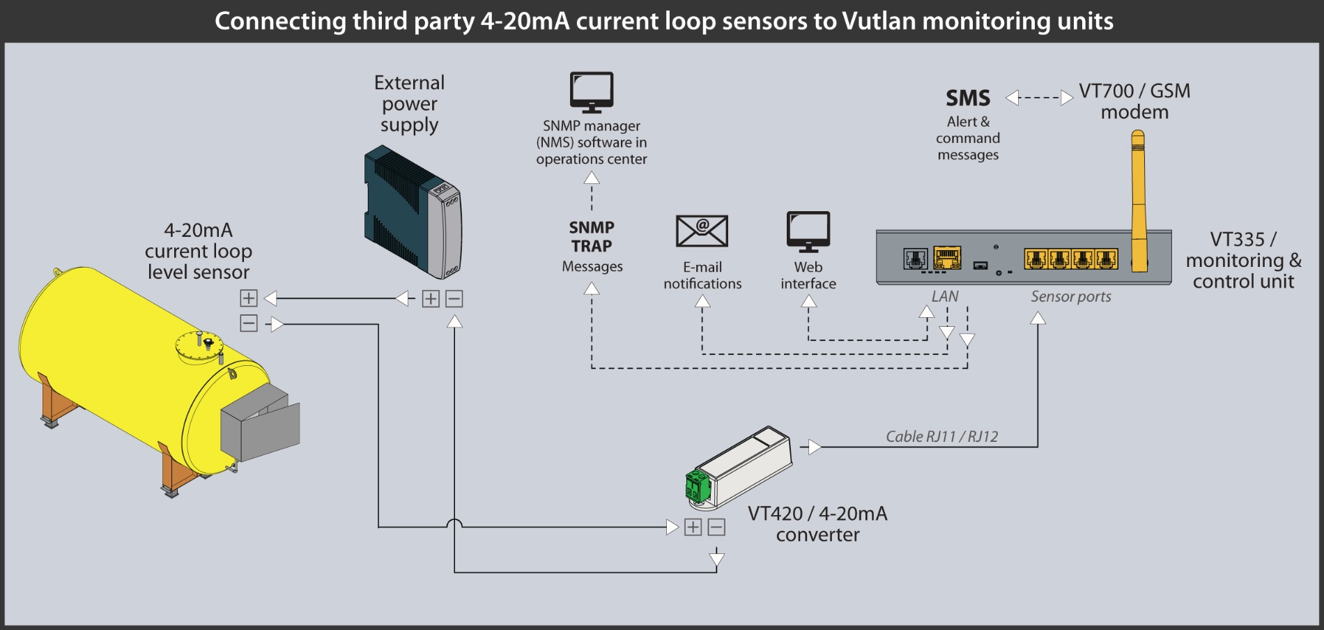 The VT420 / 4-20Ma current monitor converts measured DC current from different sensors into a format compatible with the Vutlan monitoring system. The system interface allows you to assign the sensor and introduce the function data conversion.