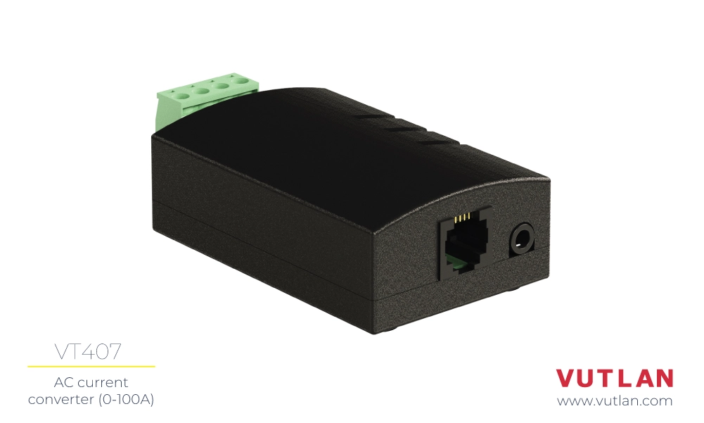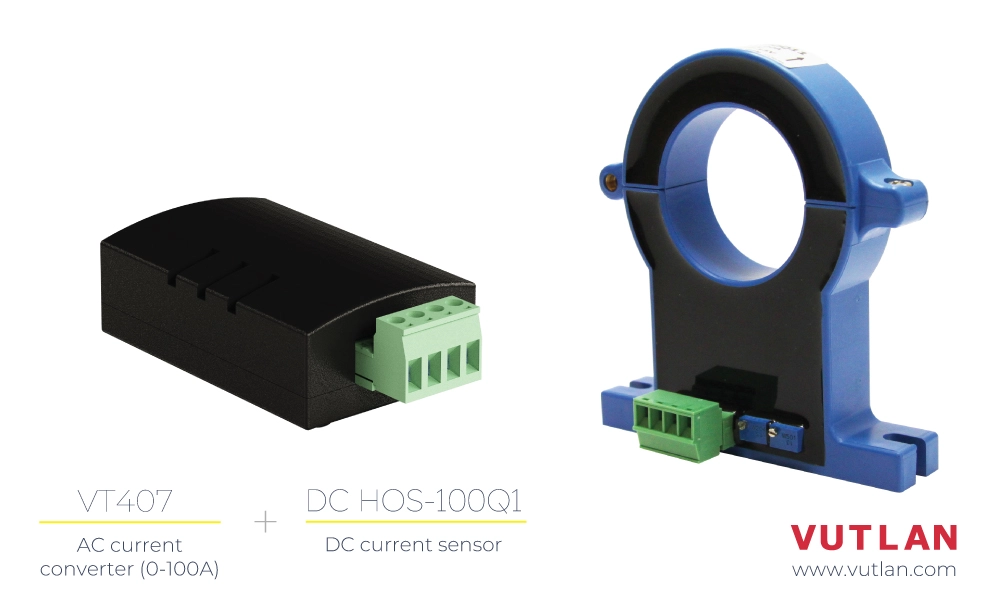Open-loop AC current transducer HAT-100Q1 can measure AC currents in the range of 0-100A. Data can be transferred to the monitoring system using AC converter VT407.