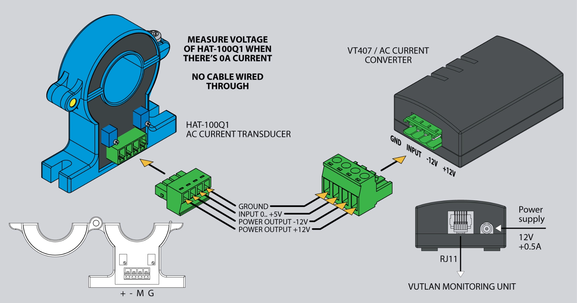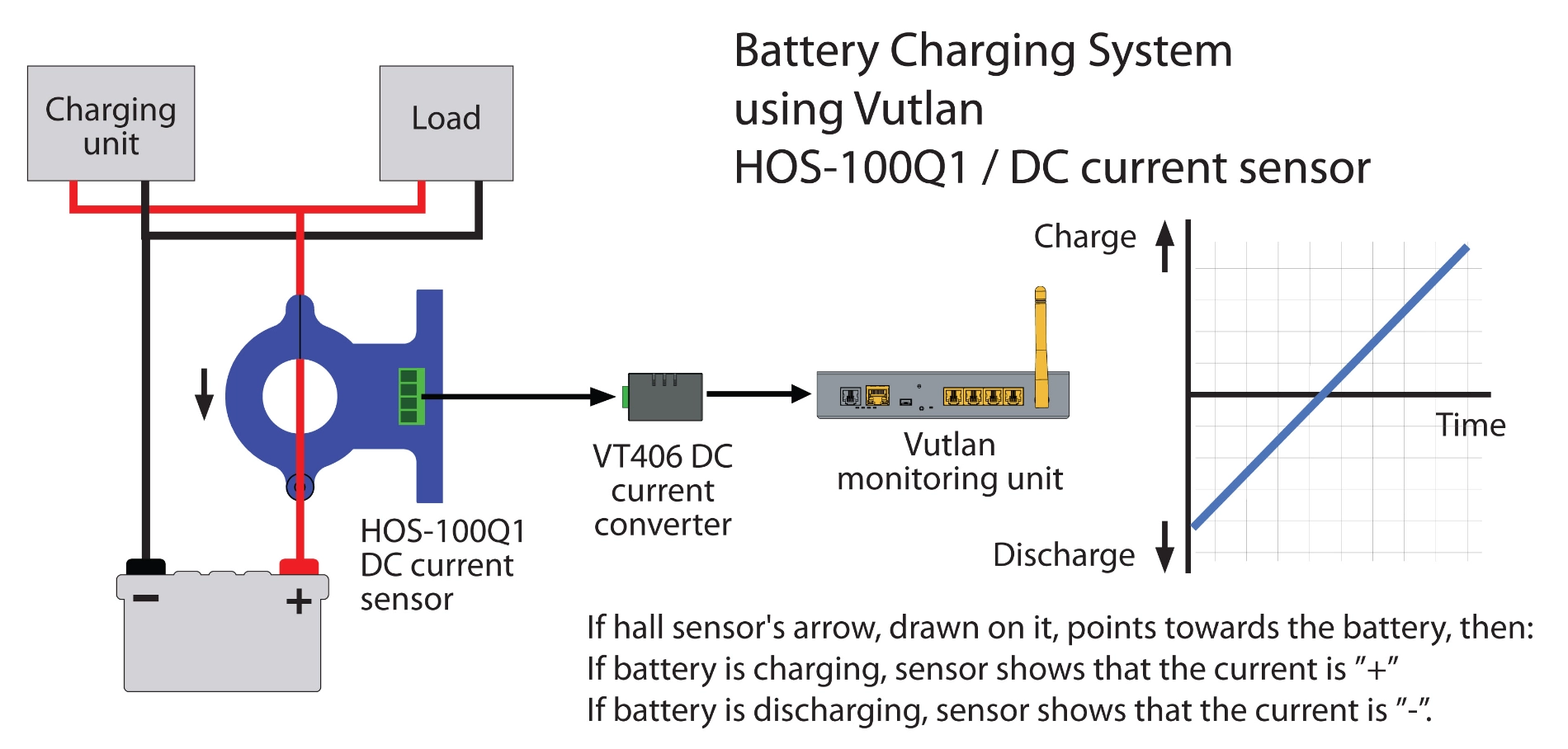 The VT406 / DC current transceiver transmits measured current data from the HOS-100Q1 DC transducer to the Vutlan monitoring device.