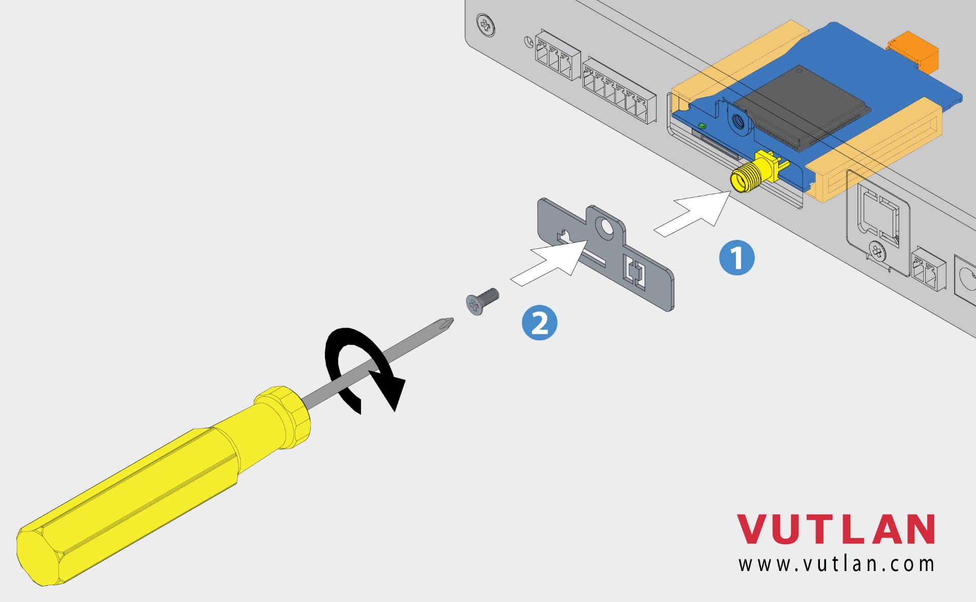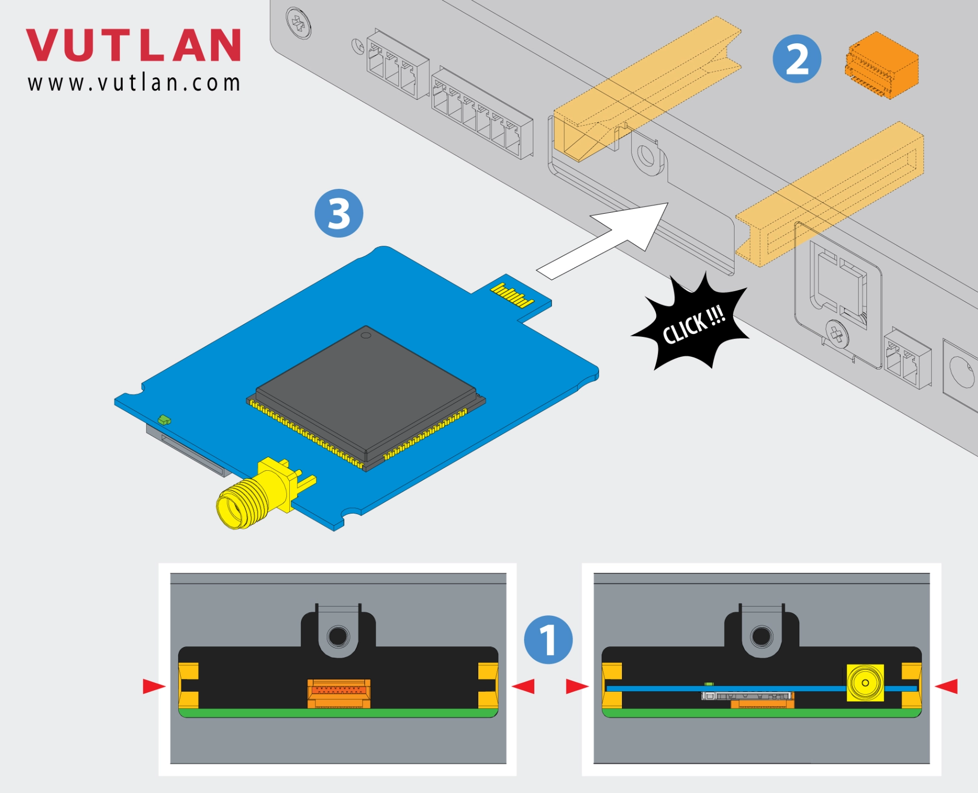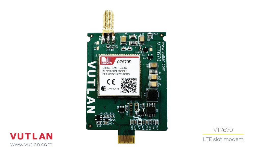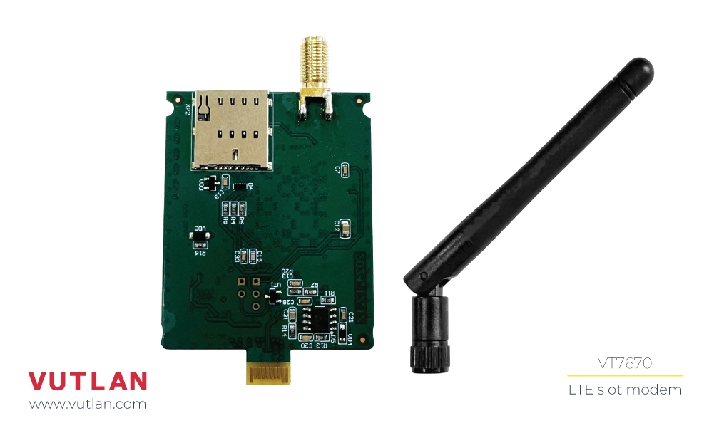 This plug-and-play board is inserted into the modem slot of Vutlan monitoring units.