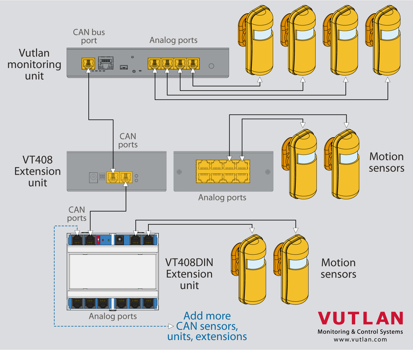 Each VT408 extension unit connected to the Vutlan monitoring device via the CAN bus adds the ability to connect 8 analog sensors to the system.