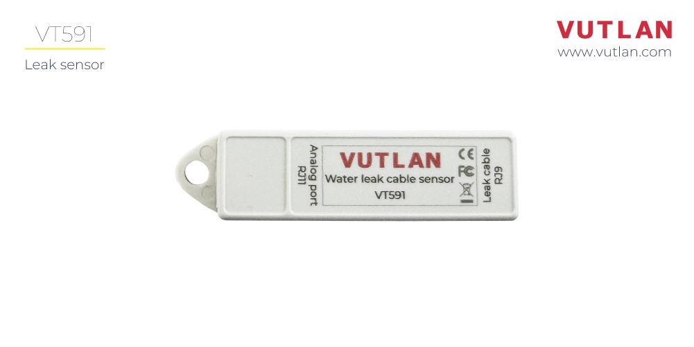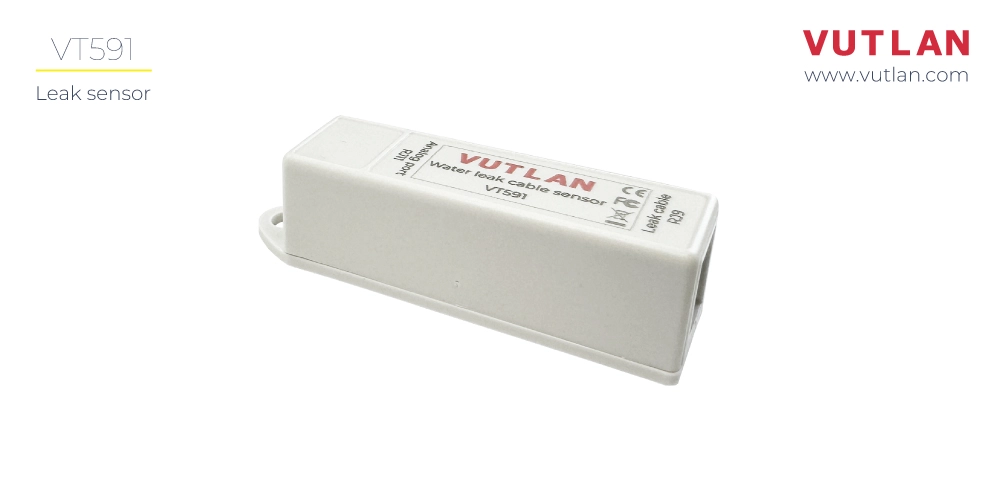 The VT591 Water leak sensor is designed to detect water leaks by measuring the resistance drop in the connected WLC Leak Detection Cable. This sensor requires a WLC Leak Detection Cable, which must be ordered separately and is available in a variety of lengths.