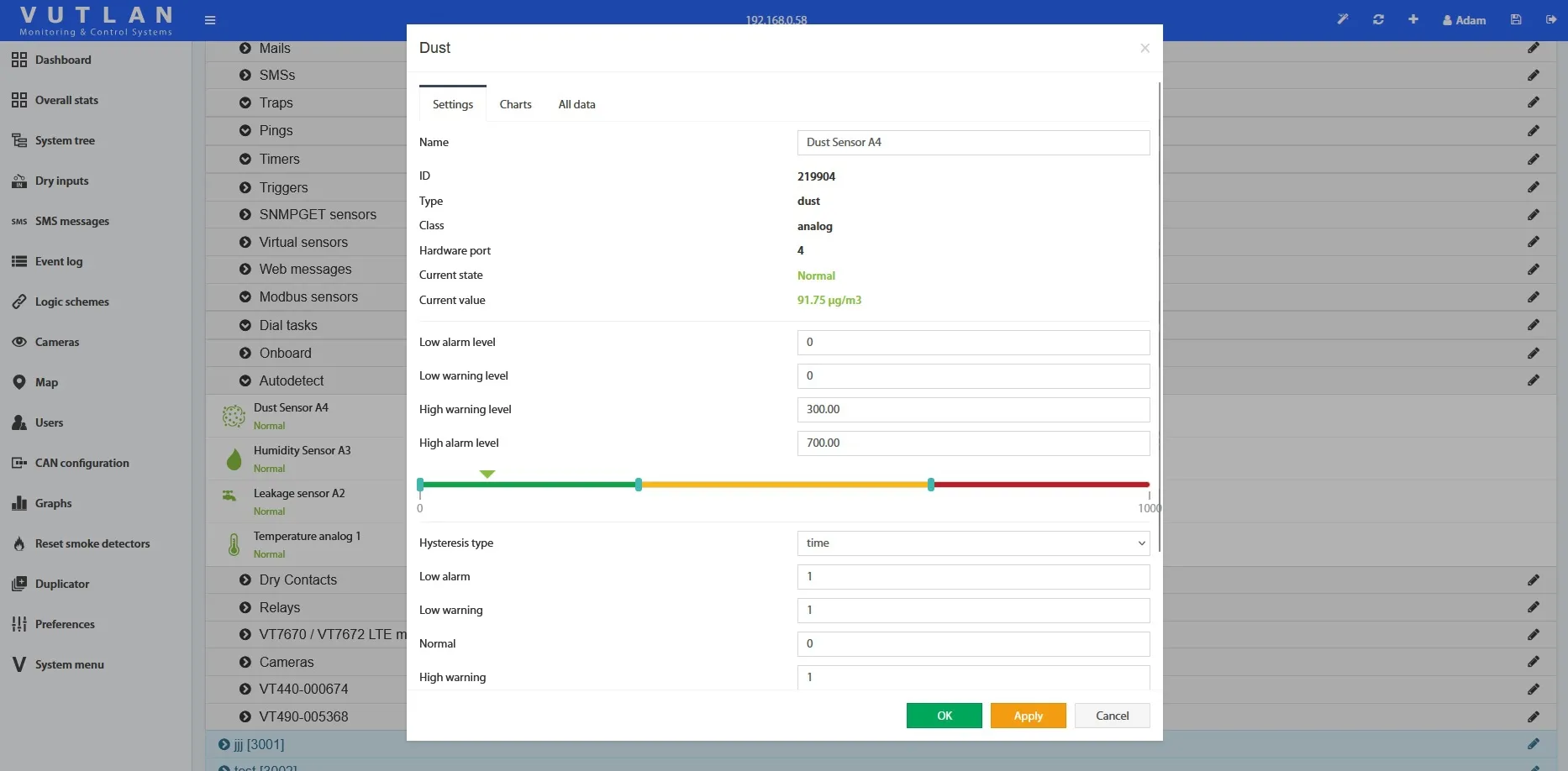 Each sensor has 5 alarm thresholds for logical control and notifications.