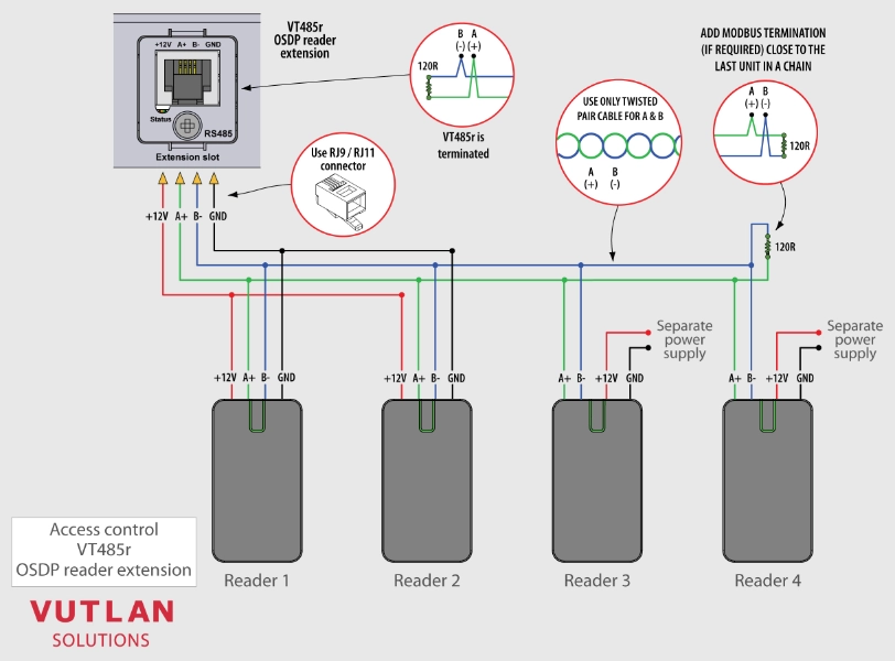 The reader is used together with VT485r / OSDPv2 reader extension slot